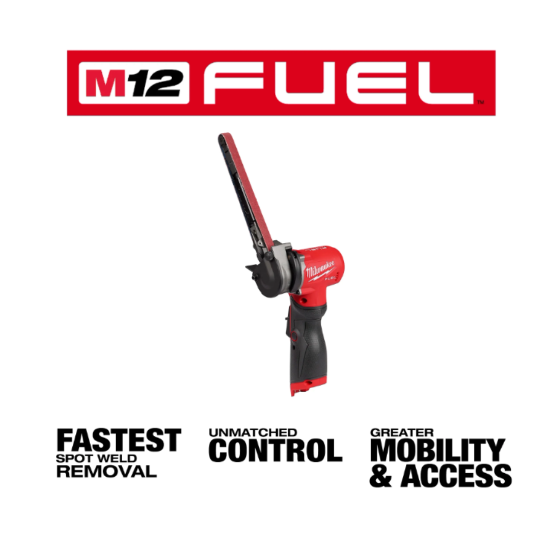 M12 FUEL™ 1/2” X 18” Bandfile is the first cordless bandfile that delivers pneumatic performance, size, and features for professional automotive, industrial, and metalworking users. Our bandfile delivers the fastest spot weld removal by leveraging our POWERSTATE™ Brushless Motor Technology. The cordless bandfile delivers unmatched control with a two-speed setting, Forward/Reverse function, a lock-on button, and a variable speed trigger. The M12 FUEL™ Bandfile has a Tool Free 360⁰ Arm Rotation and provides greater mobility & access. With the M12™ REDLITHIUM™ XC4.0 Battery, this product removes up to 50 spot welds per charge.