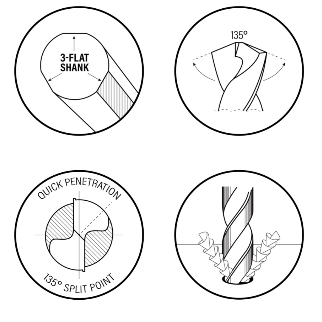 Premium grade KnKut Drills are manufactured from a high grade Molybdendum high speed steel, that has high vanadium content. KnKut Performance Drills are salt nitride treated, actually penetrating the tools surface giving KnKut Drills the hardness to drill tough materials such as stainless steel and titanium alloy.