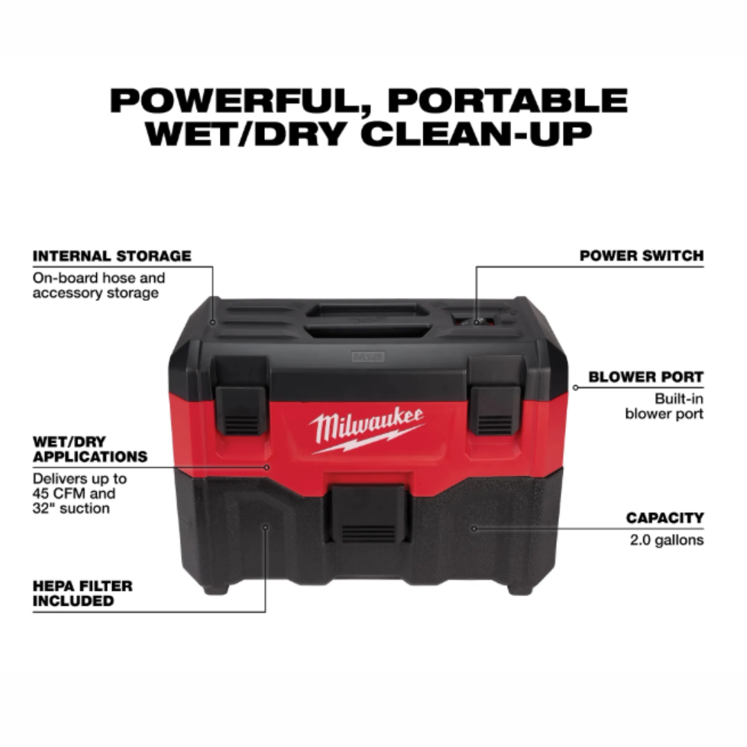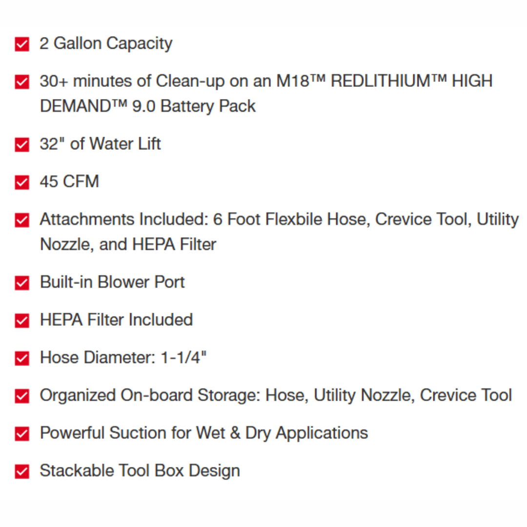 The M18™ 2-Gallon Wet/Dry Vacuum provides users with a Powerful and Portable Wet/Dry Clean-up tool. A high performance motor creates powerful suction for both wet and dry applications. Its stackable design and organized on-board storage keeps all of the attachments inside the unit for convenient transport and storage. The 0880-20 comes with a flexible hose, crevice tool, utility nozzle, and a certified HEPA filter. With 30+ minutes of run time on a M18™ REDLITHIUM™ HIGH DEMAND™ 9.0 Battery Pack, its ideal for extended spot and area clean up.